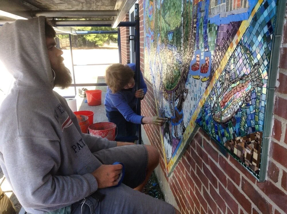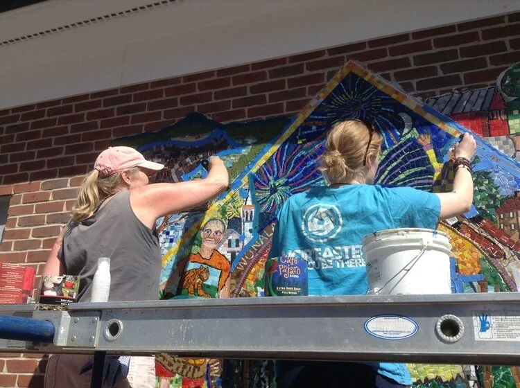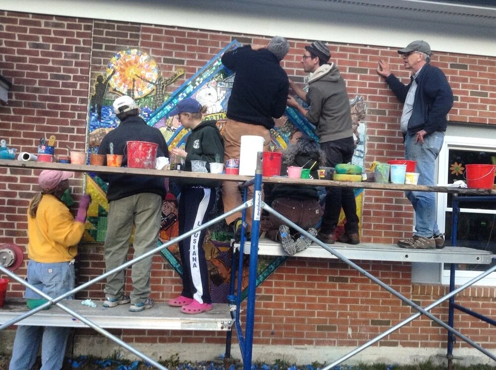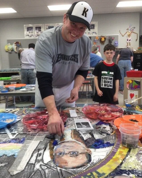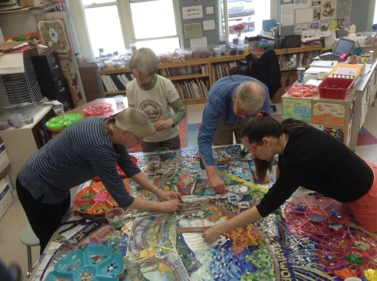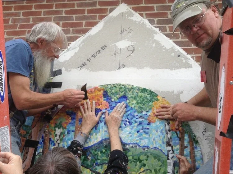 A hive of activity as dedicated volunteers grout one mosaic and mount a second under the tutelage of mural artist David Fichter, captured beautifully by Wyatt Berrier. Just one of many such days on a project supported by extraordinary volunteer efforts and many generous donors, sponsors and funders.