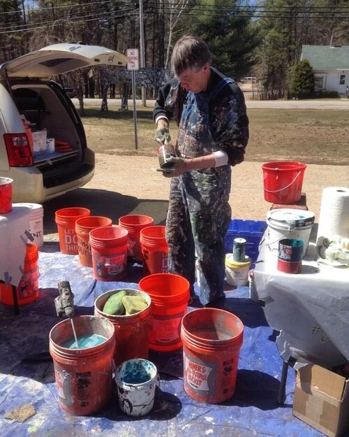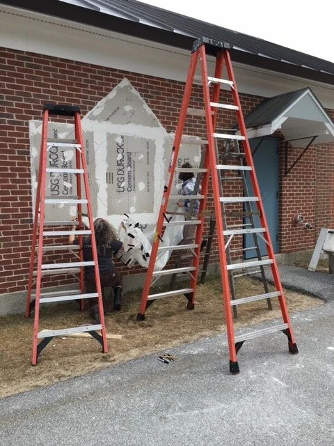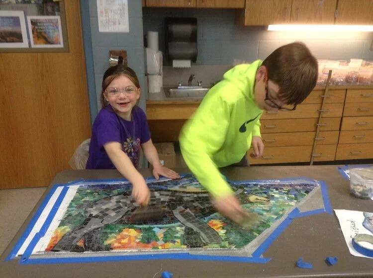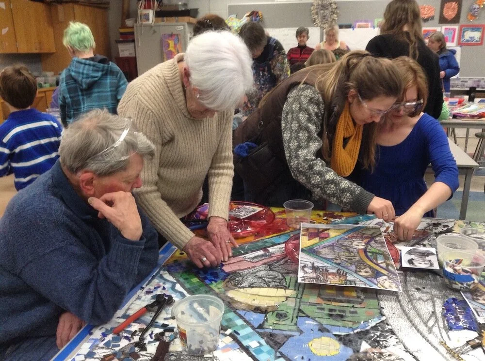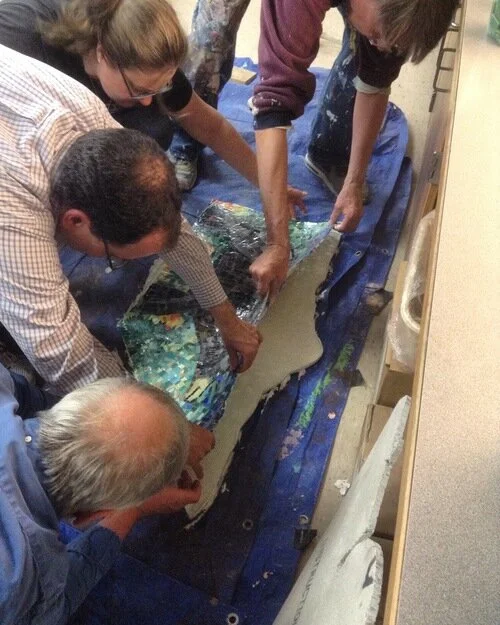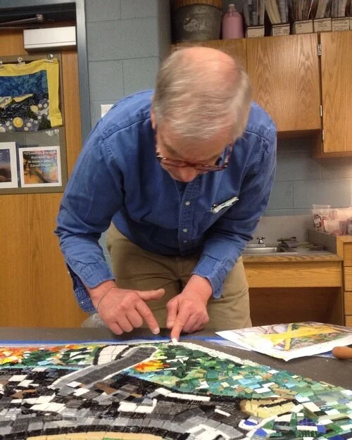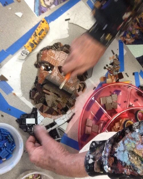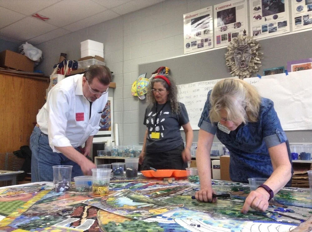 A hive of activity as dedicated volunteers grout one mosaic and mount a second under the tutelage of mural artist David Fichter, captured beautifully by Wyatt Berrier. Just one of many such days on a project supported by extraordinary volunteer efforts and many generous donors, sponsors and funders.