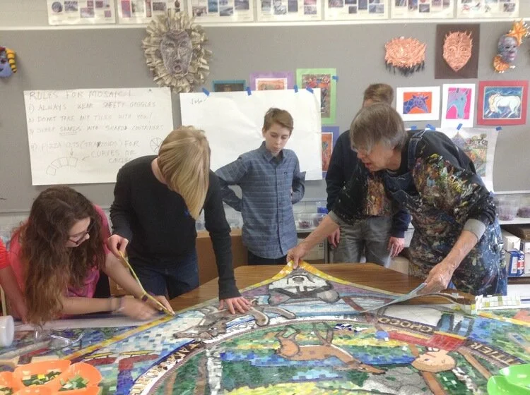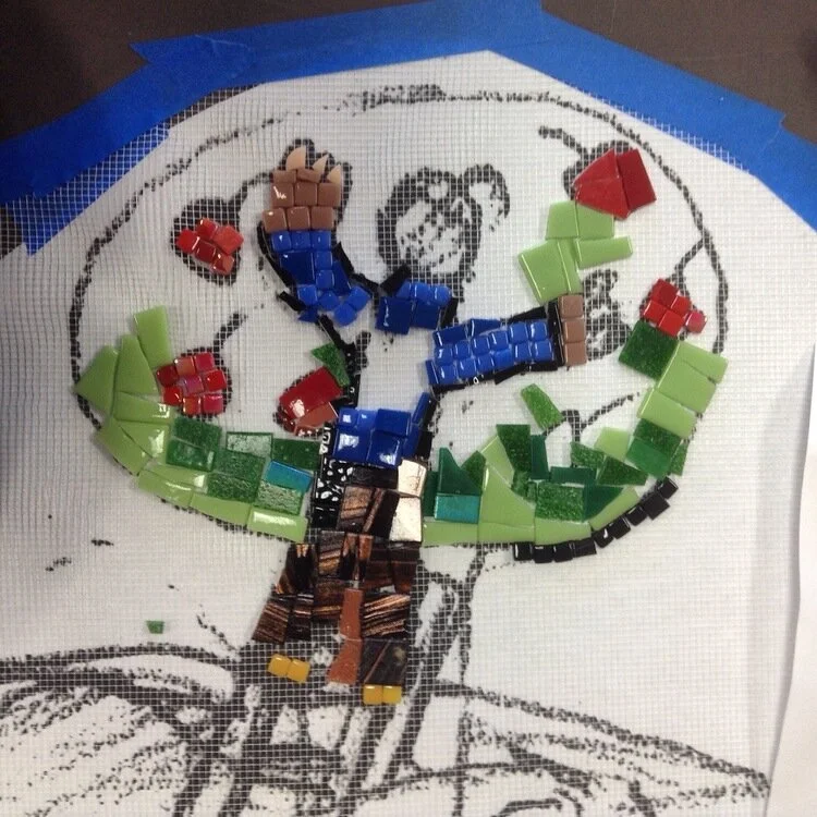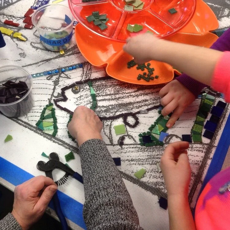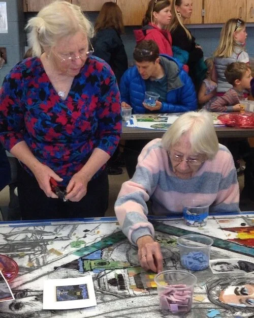 We had an amazing community response to every stage of the mosaic process. Hundreds of kids and adults, helped along the way by many dedicated volunteers, built, mounted and grouted two gorgeous mosaics. Thank you, amazing community, amazing volunteers, and all our donors, sponsors and funders! Watch the slide show and/or scroll down below the slideshow to learn more about who's who and what's what on the mosaic.