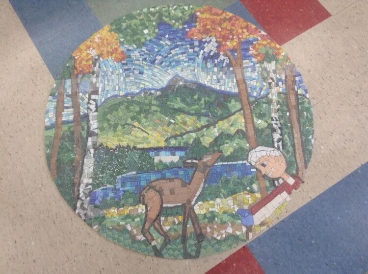 Both mosaics contain images based on drawings by K. A. Brett students; this one contains many kids’ drawings that David has woven together. The center of the mosaic depicts Mount Chocorua and Chocorua Lake, a view familiar to many the world over—it’s even on a US quarter. The mountain in the top left of the mosaic is Black Snout in South Tamworth, the highest geographical point in Tamworth (also the bear has a black snout…), and some people believe that the composite apple and dairy farm on the top right is way up at the top of Mountain Road. The church on the left of the mosaic is Saint Andrews-in-the-Valley, in Whittier, and above it to the right is the Wonalancet Chapel. The building on the right of the mosaic is The Other Store in an earlier incarnation, and above it to the left is the Bradbury Jewell house, said to be the first timber frame building in Tamworth. We enjoy the outdoor world all year round, collecting maple sap and boiling it into syrup and spotting wild animals in the spring, fishing for rainbow trout, enjoying our lakes and rivers and watching the fireworks on the 4th of July in the summer, harvesting the bounty of our gardens in the autumn, skiing, skating and racing sled dogs in the winter. And that pig? Is he a Tamworth pig? Maybe the famous one who escaped and made it all the way to school one day?